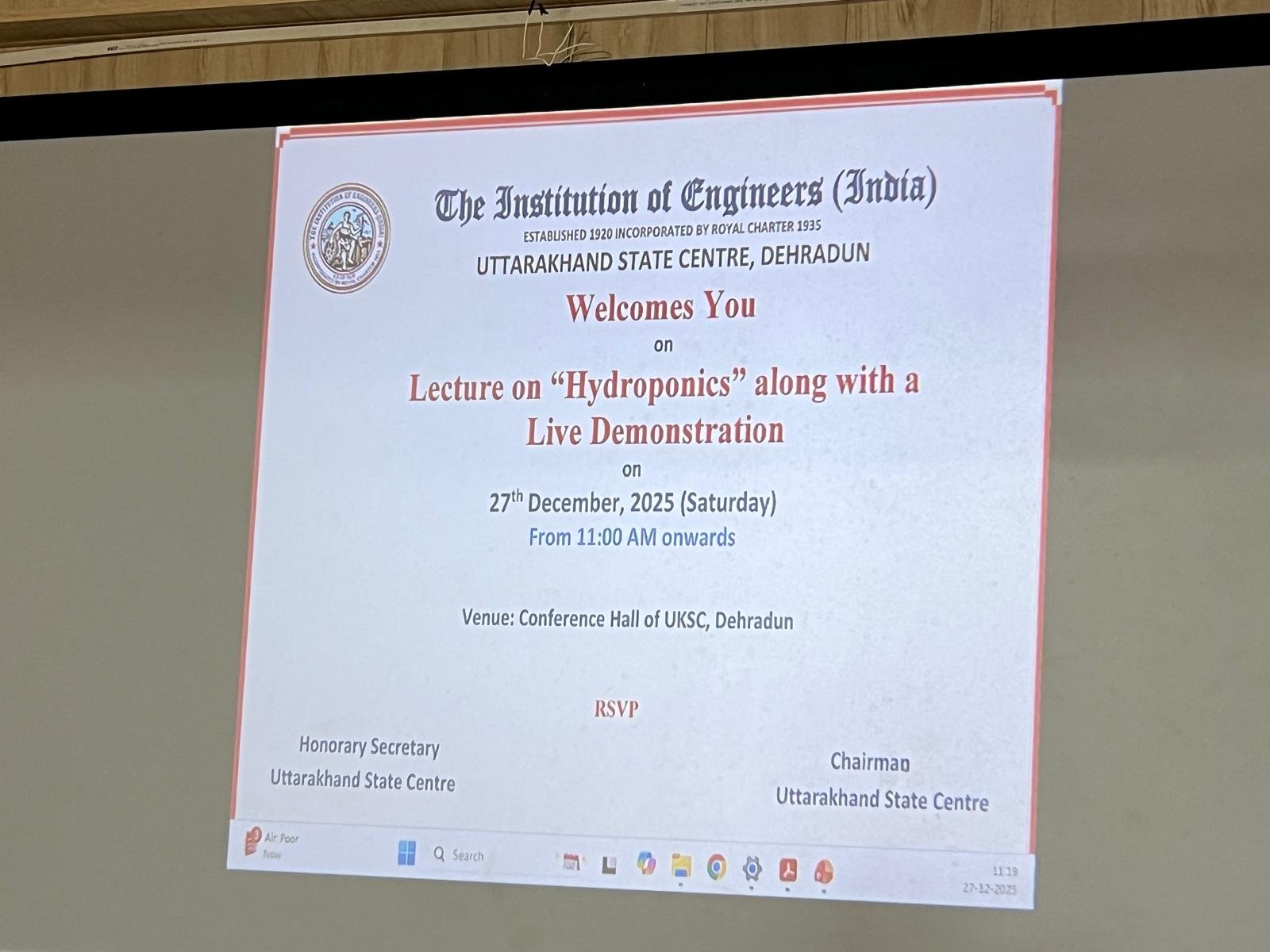 We hosted an event at the Institute of Engineers in Dehradun, India, an institute of retired professional engineers at the largest government and corporate roles to collaborate and work together. This event featured a technical exploration of hydroponics and methods of water purification, and a hydroponic farm was installed as well.